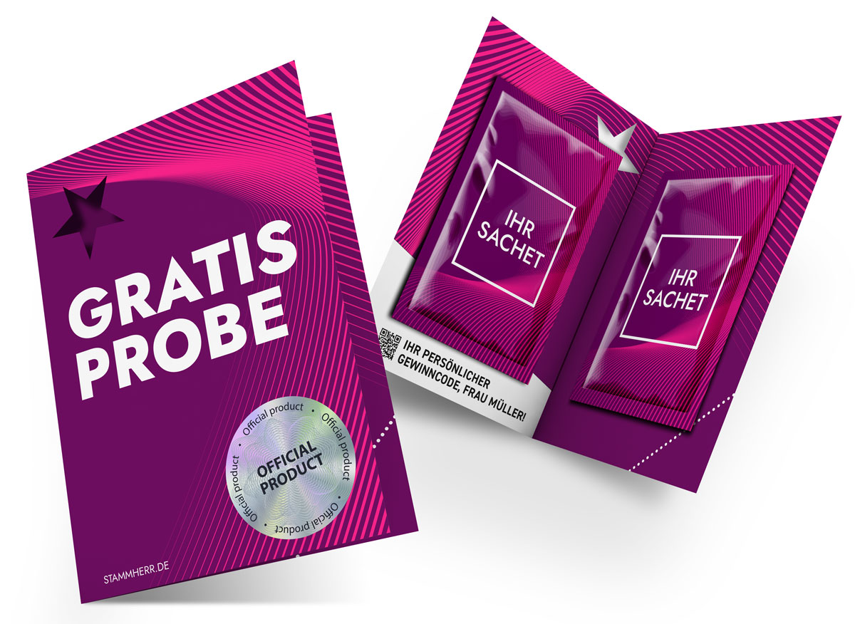 Wir integrieren Ihre Produktproben vollautomatisch auf oder in Ihre Printwerbung – exakt nach Ihren Anforderungen. Gerne übernehmen wir auch den Druck für Sie oder bei Bedarf auch die Verteilung von Warenproben mit unseren Partner-Promotionagenturen.